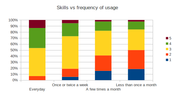 At a high level, the more experienced user are the higher they will rate their skill. It takes between 6 months for user to take advantages of OpenRefine. This is only after this time period that user move their skills from a 2/5 to a 3/5. After two years of usage no user rate his skills 1/5.